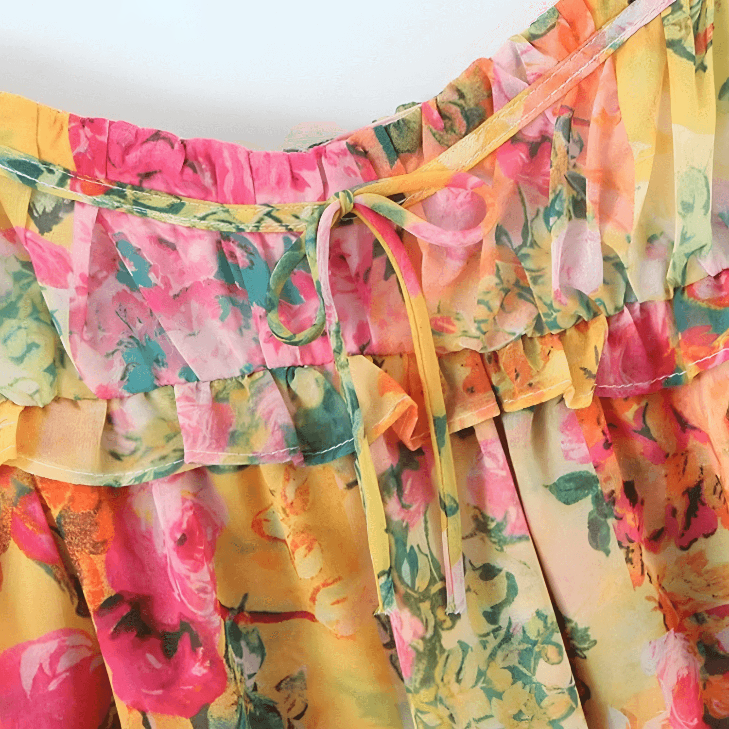 🌸 Büyüleyici stil: Elbise, zarif çiçek deseni ve fırfırlı katmanlarıyla feminen ve hafif bir görünüm yaratır.