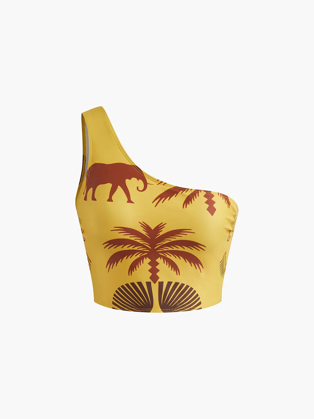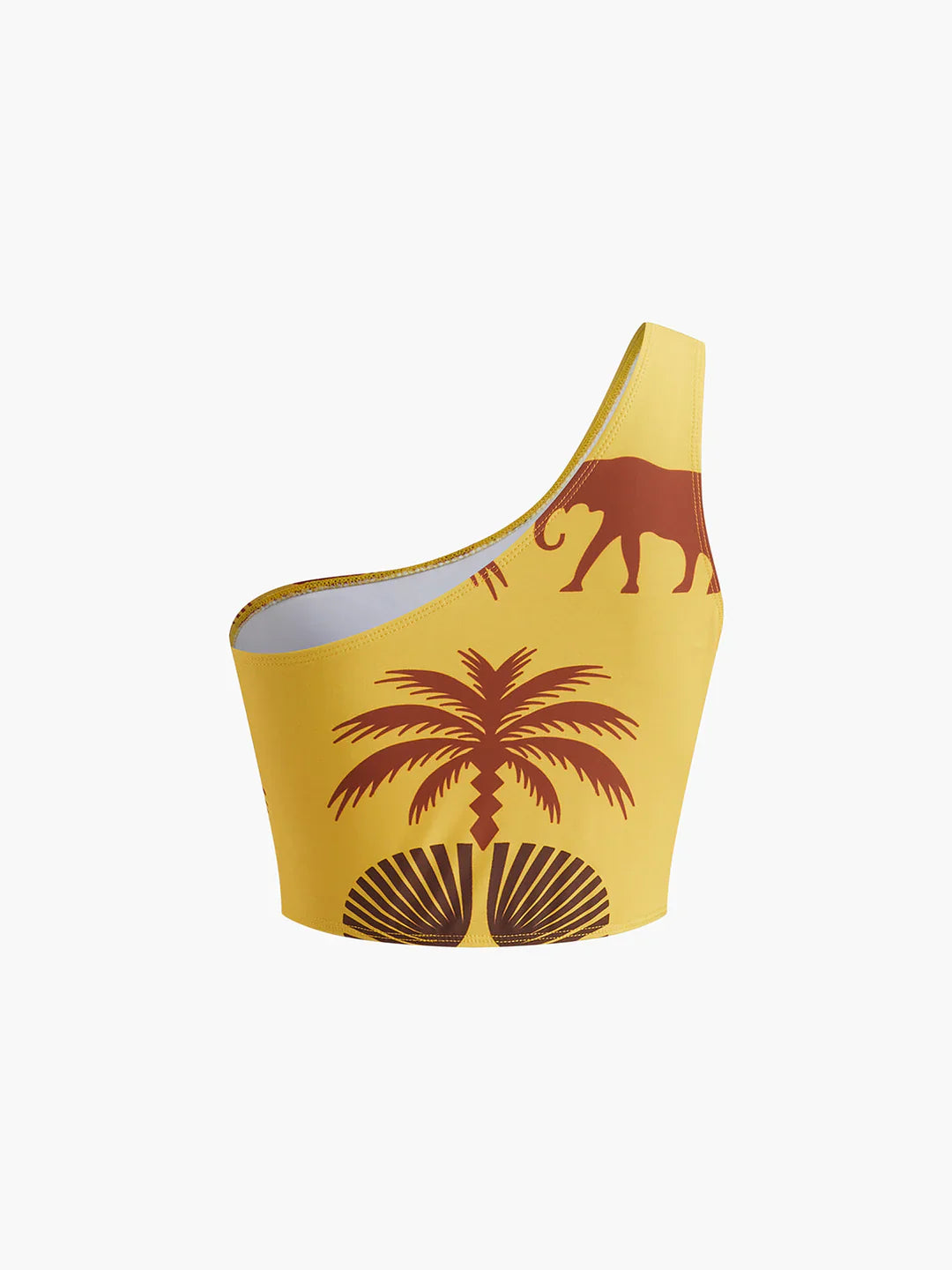 Tek omuzlu (one-shoulder) asimetrik tasarımıyla dikkat çeker.
