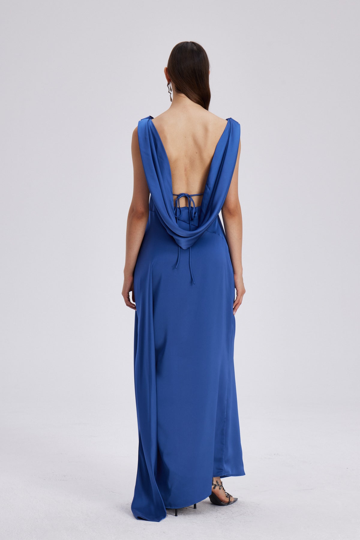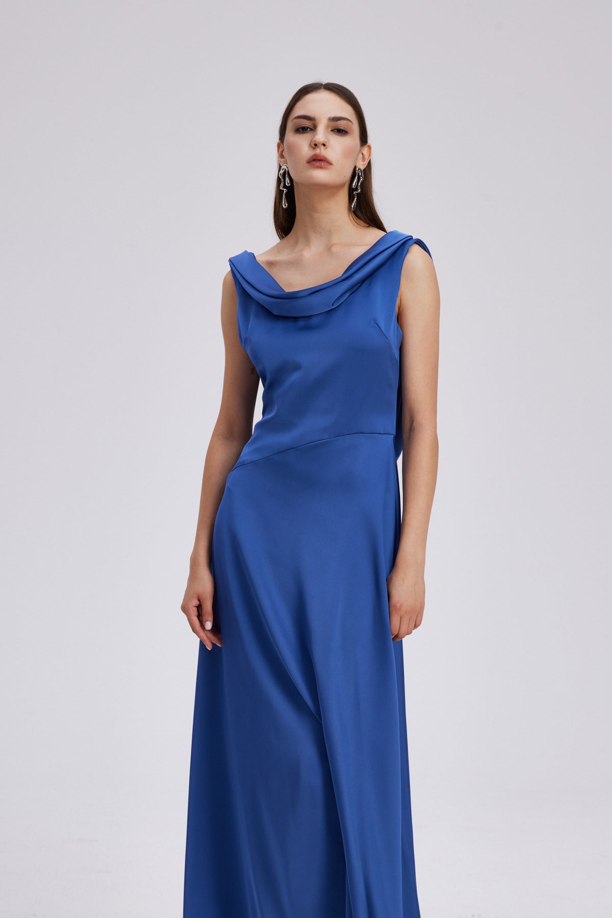 Fiyonklu Sırtı Açık Saten Uzun Elbise