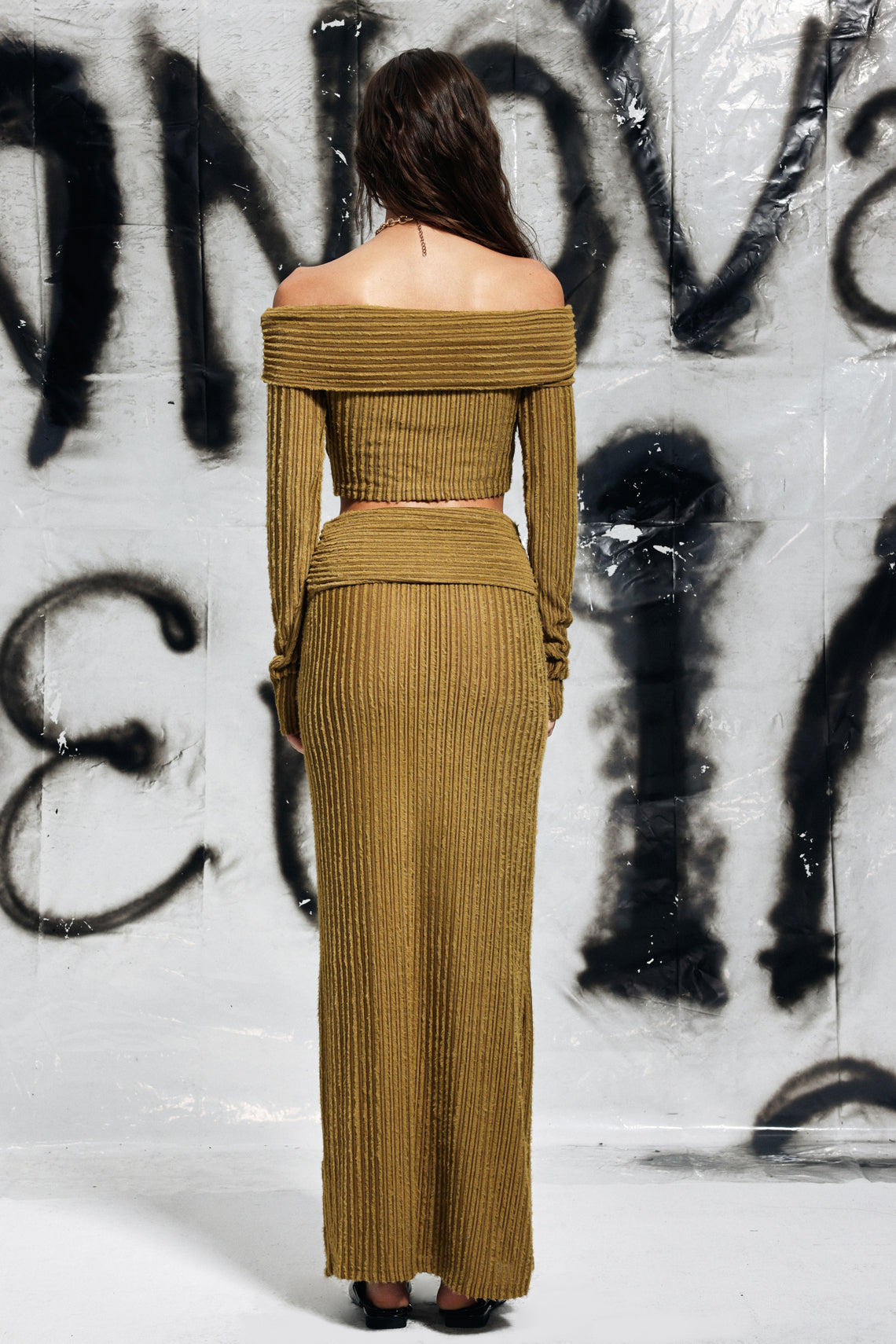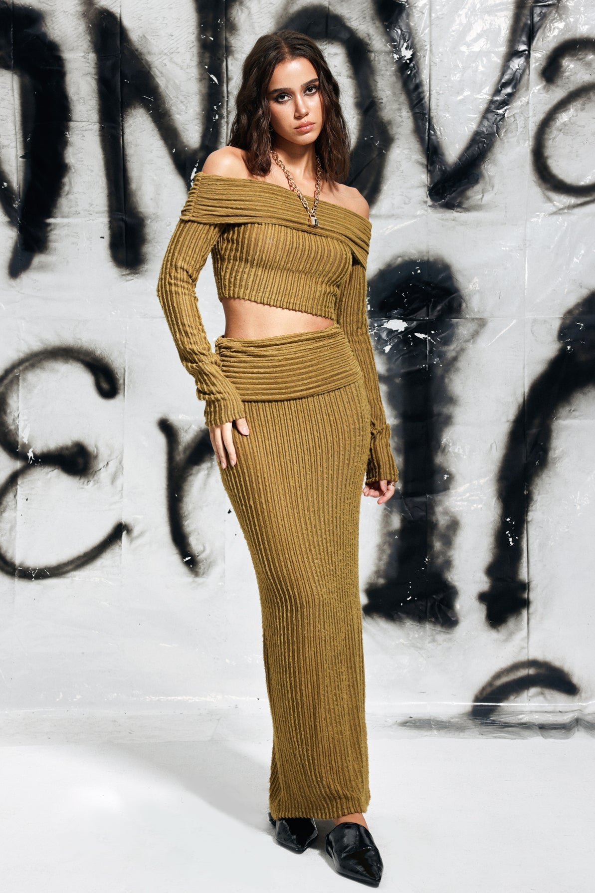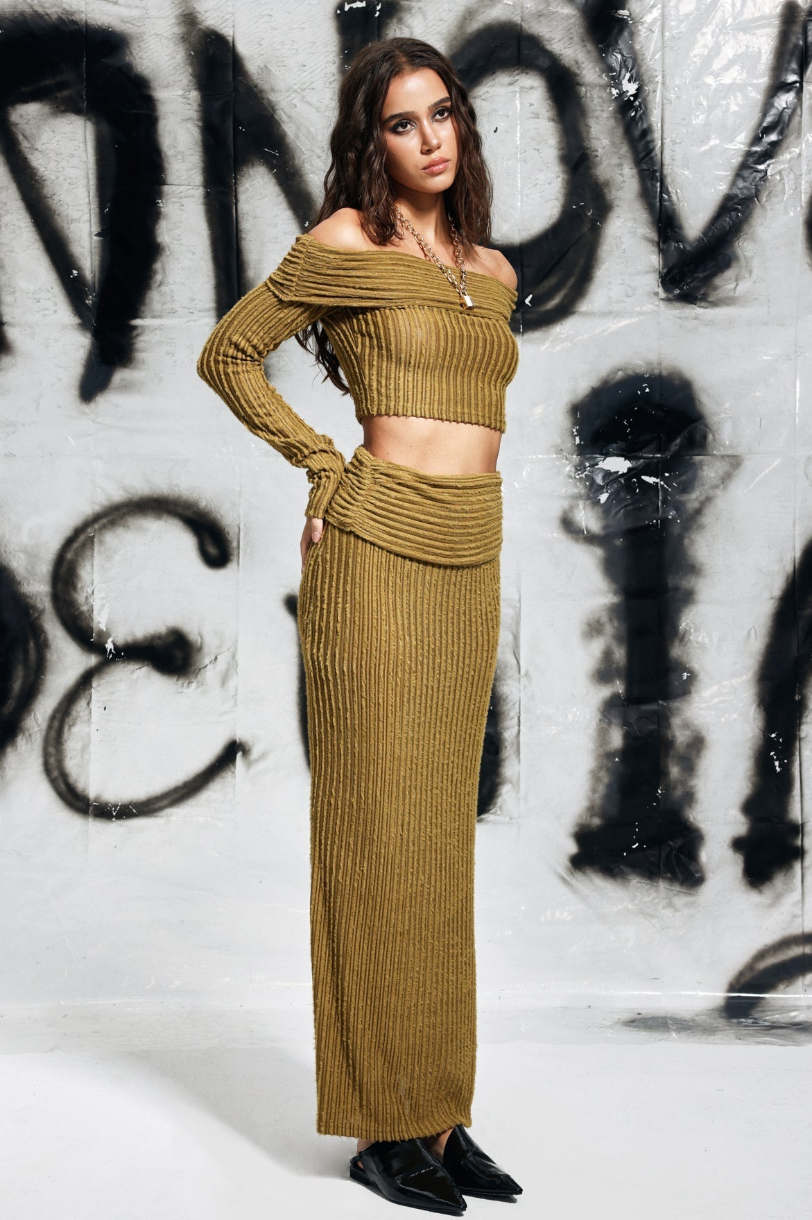 Carol Düşük Omuz Çizgili Bodycon Etek Takım