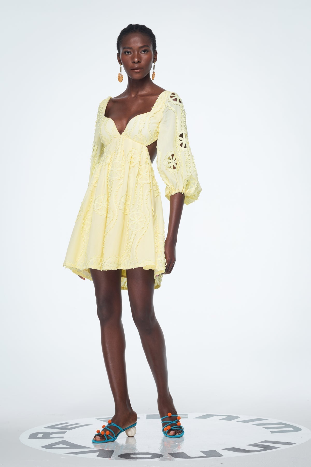 Sarı Renkli Kesik Balon Kol Volanlı Mini Elbise
