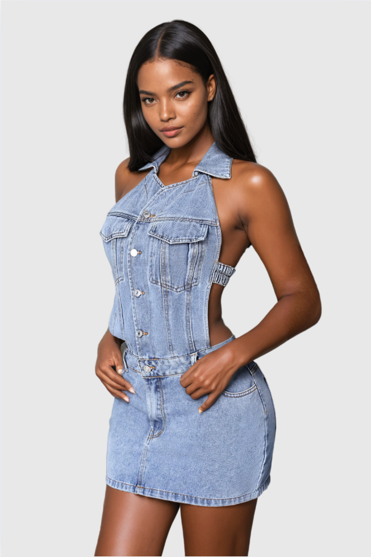 Aerilyn Sırtı Açık Boyundan Bağlamalı Denim Mini Elbise