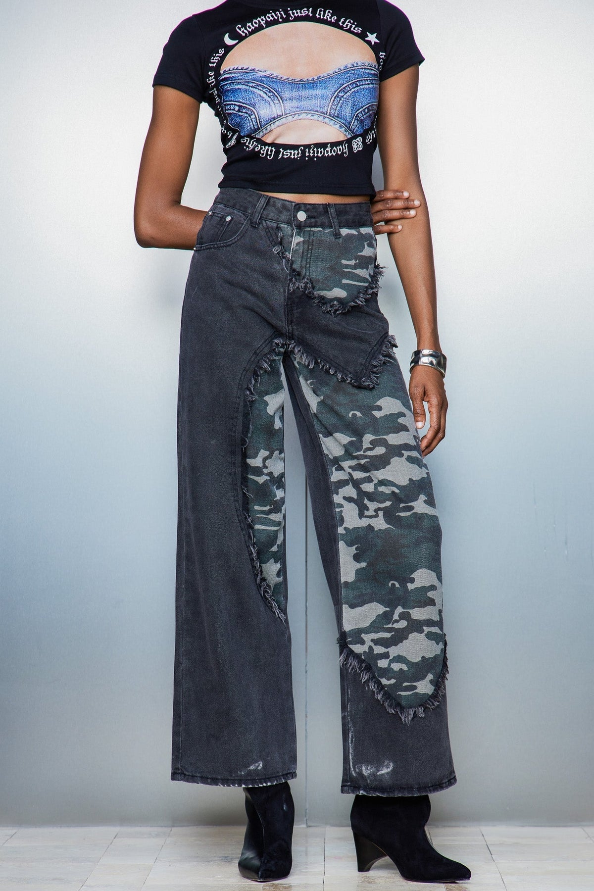 Kamuflaj Baskılı Asimetrik Kot Pantolon